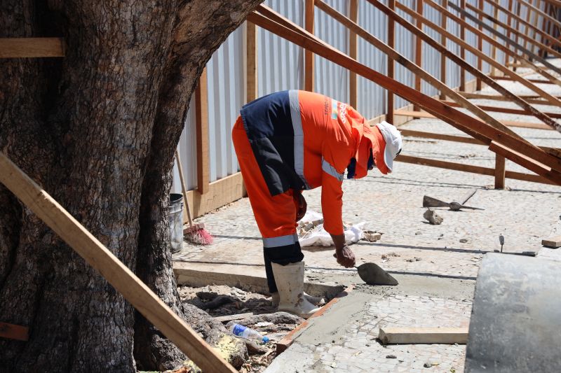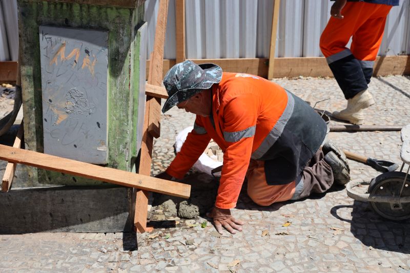 Na obra, os operários realizam a implantação de novas pedras portuguesas em mosaico, com basalto e calcário de formatos irregulares, preservando a estética tradicional e ao mesmo tempo oferecendo mais segurança aos pedestres que circulam diariamente pelo espaço.