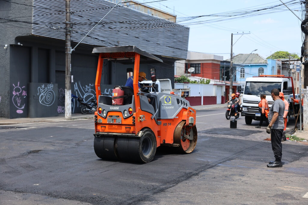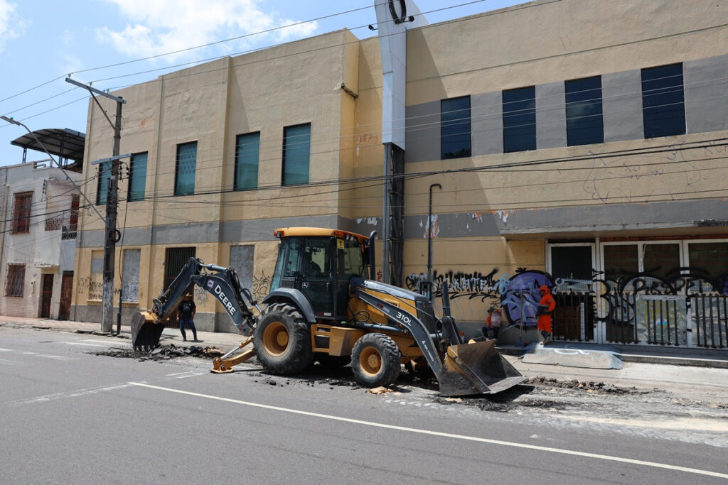 A Prefeitura de Manaus, por meio da Secretaria Municipal de Infraestrutura (Seminf), intensificou, nesta segunda-feira, 22/9, os serviços de manutenção asfáltica na avenida 7 de Setembro, no cruzamento com a Duque de Caxias, no coração do centro histórico. O trecho, de tráfego intenso, recebeu aplicação de massa asfáltica para corrigir desníveis e garantir mais fluidez e segurança no trânsito.