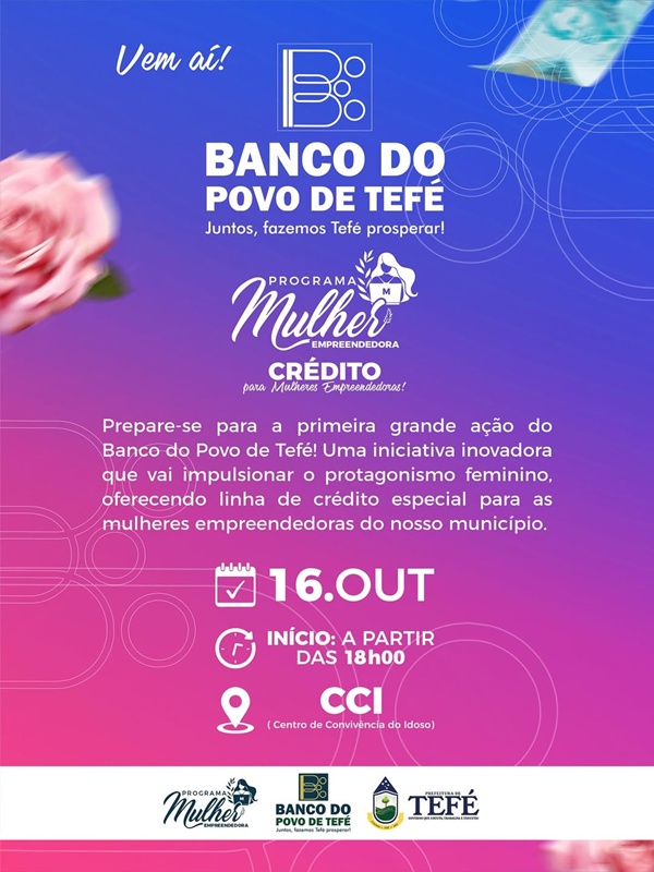 A Prefeitura de Tefé realiza nesta quarta-feira, 16 de outubro, o lançamento oficial do Banco do Povo de Tefé e da primeira linha de crédito do Programa Mulher Empreendedora, em evento aberto ao público, a partir das 18h00, no Centro de Convivência do Idoso (CCI).