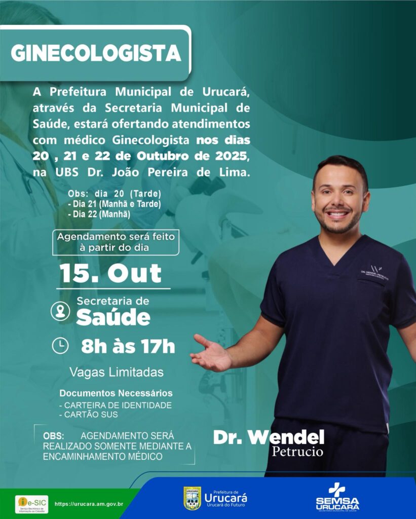 A Prefeitura de Urucará, por meio da Secretaria Municipal de Saúde, estará ofertando consultas com o Dr. Wendel Petrucio nos dias 20, 21 e 22 de outubro, na UBS Dr. João Pereira de Lima.