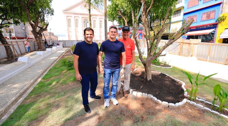 Prefeito David Almeida e vice Renato Junior realizam plantio de oliveiras na fase final do restauro da praça dos Remédios e destacam cuidado histórico e social no Centro