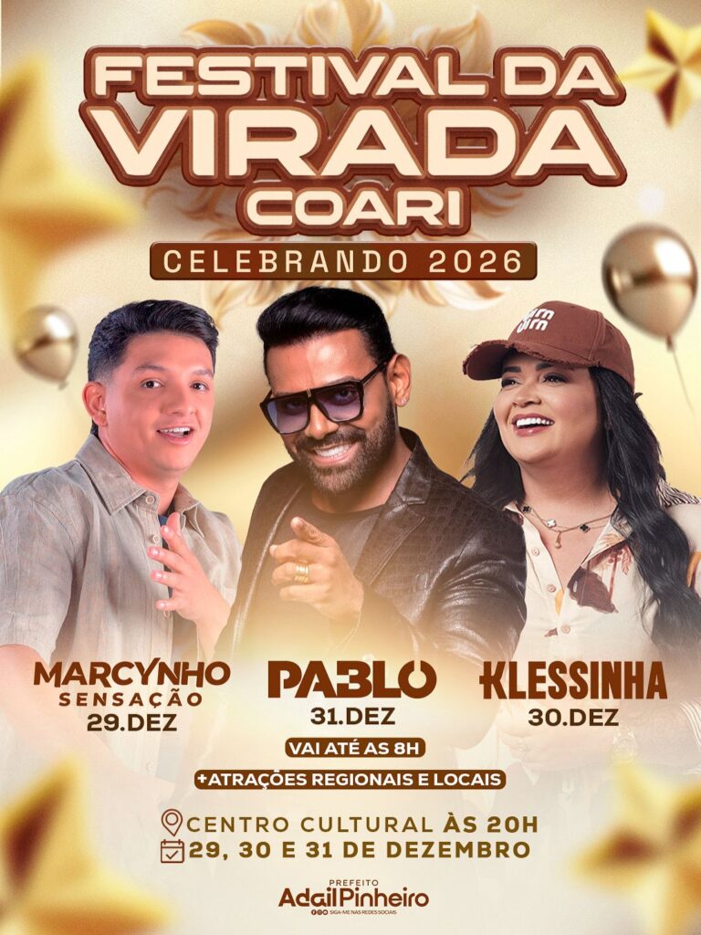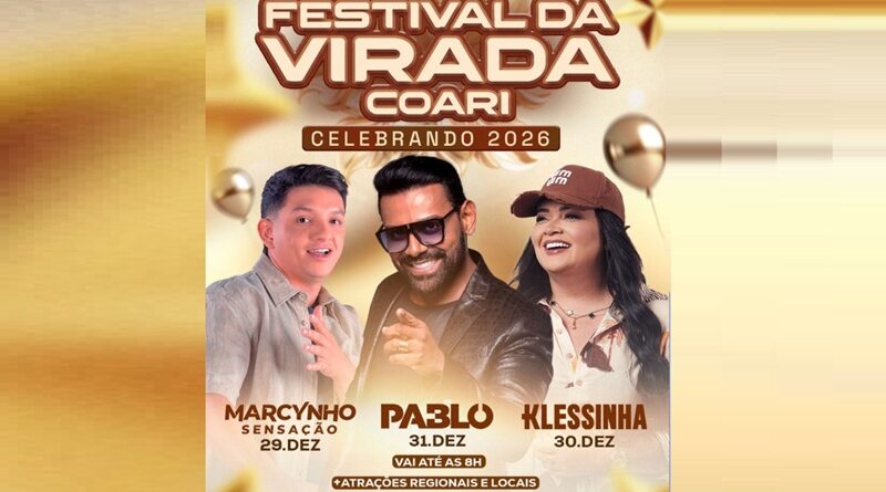 A Prefeitura de Coari anunciou oficialmente o Festival da Virada Coari – Celebrando 2026, que promete encerrar o ano em grande estilo e abrir o novo ano com muita festa, música e gratidão pelos avanços e conquistas do ano. O evento acontecerá nos dias 29, 30 e 31 de dezembro, no Centro Cultural, a partir das 20h, com uma programação especial que reúne grandes nomes da música nacional e artistas regionais.
