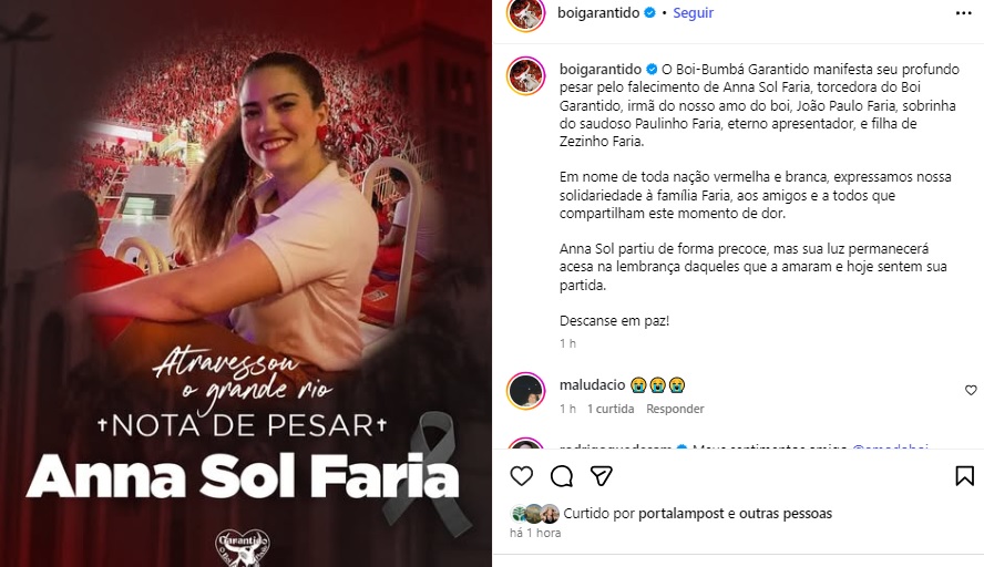 No comunicado, o Garantido destacou a ligação de Anna Sol com a história e a tradição da agremiação. “O Boi-Bumbá Garantido manifesta seu profundo pesar pelo falecimento de Anna Sol Faria (…). Em nome de toda nação vermelha e branca, expressamos nossa solidariedade à família Faria, aos amigos e a todos que compartilham este momento de dor. Anna Sol partiu de forma precoce, mas sua luz permanecerá acesa na lembrança daqueles que a amaram”, diz o texto.