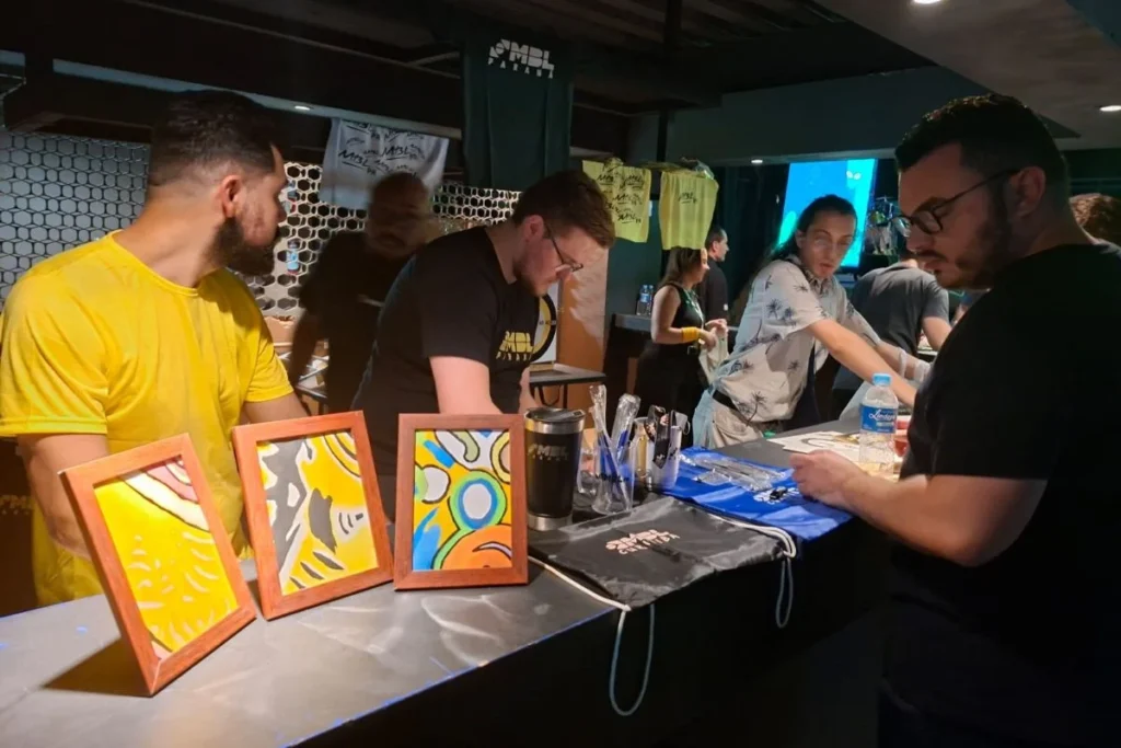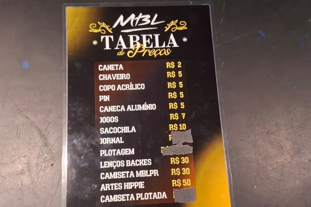 O espaço mais nobre do evento é um palanque em 360º, rodeado pelo público, que pagou R$ 49,90 para estar lá. De um lado do palco, uma bandeira de Pernambuco. De outro, o estande do MBL do Paraná, que vendia caneta, chaveiro, camiseta e peças de arte plástica abstrata de um dos integrantes do núcleo paranaense que se diz integrante do movimento hippie.