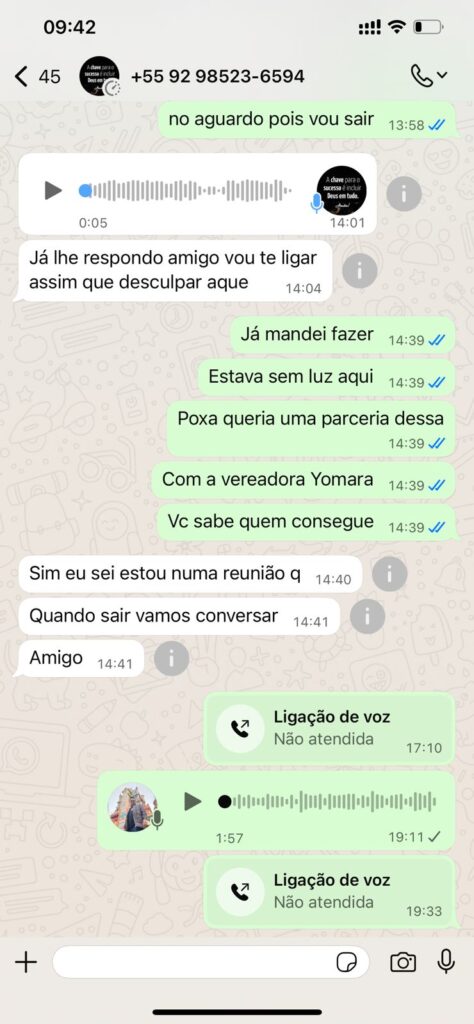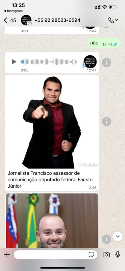 Logo no inicio da conversa ele diz ser jornalista Francisco e se apresenta como assessor de comunicação do Deputado Federal Fausto Jr, o portal Manchete entrou em contato com todos da equipe do Deputado que foi informado que não conhecem este cidadão e que ele não fez e nem faz parte da equipe do Deputado.