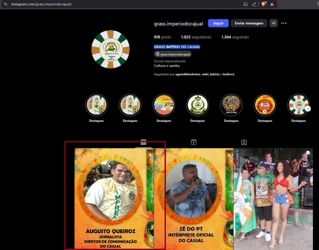 Ele cita que é da Comunicação da Escola de Samba GRASS IMPÉRIO DO CAJUAL