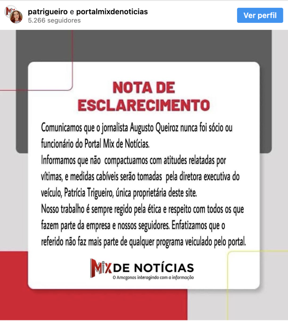 O jornalista Augusto Queiroz, foi acusado por um grupo de pessoas que relataram várias tentativas de golpe na cidade de Manaus. O caso veio à tona após a jornalista Patrícia Trigueiro, receber denúncias de vítimas que se uniram informando que ele prometia “cotas” para portais com contratos do governo e a prefeitura de Manaus, além de afirmar que era sócio do Portal Mix de Notícias na época