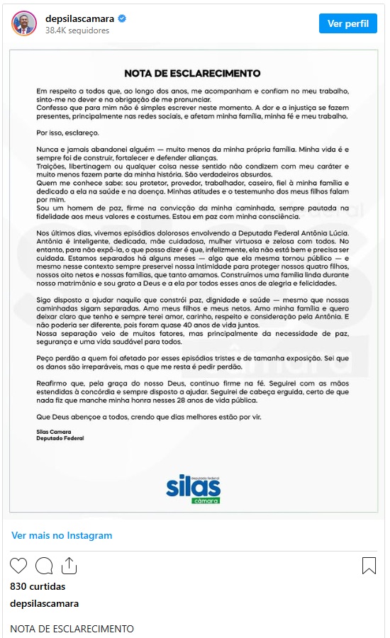 Amazonas – O deputado federal Silas Câmara, que também exerce a função de pastor na Igreja Assembleia de Deus, divulgou uma nota oficial de esclarecimento sobre as recentes polêmicas envolvendo sua ex-esposa, a deputada Antonia Lucia. A parlamentar fez sérias acusações contra o ex-companheiro, incluindo supostas traições e o uso de álcool e cigarro, informações que foram prontamente negadas por Silas Câmara. Em sua nota, o deputado afirmou que “a dor e a injustiça se fazem presentes” em relação às acusações publicadas por sua ex-esposa, refutando veementemente as alegações feitas por Antonia Lucia. O político também mencionou que “infelizmente, ela não está bem e precisa ser cuidada”, sugerindo que o comportamento da ex-companheira pode estar relacionado a um momento de vulnerabilidade pessoal. Silas Câmara expressou pesar pelos “episódios tristes e de tamanha exposição”, destacando que, apesar das acusações, lamenta o impacto das revelações tanto para ele quanto para sua família. No entanto, o deputado se posicionou em defesa de sua imagem e reputação, reafirmando seu compromisso com os princípios que orientam sua vida pública e religiosa.