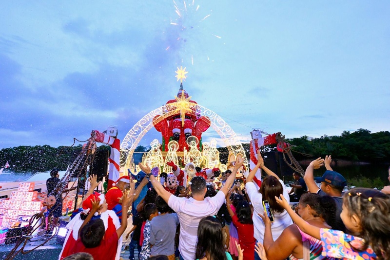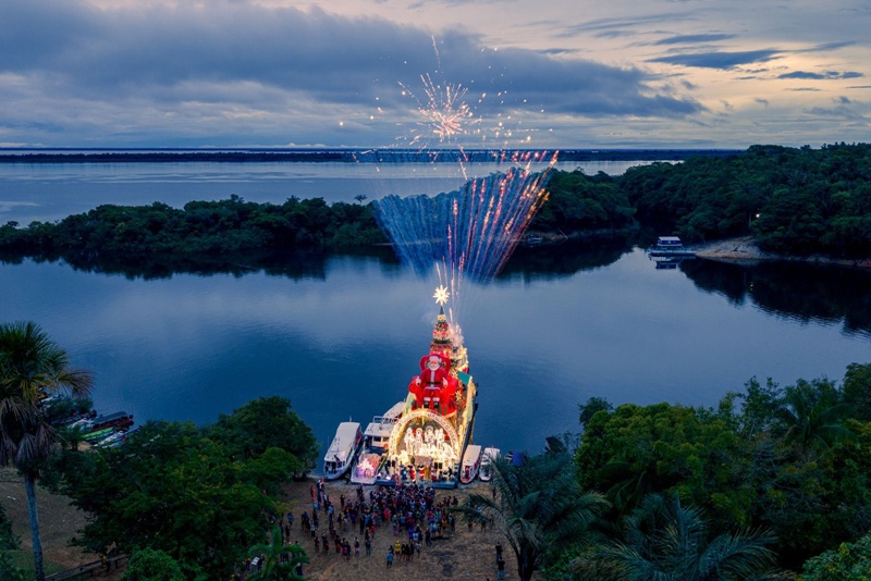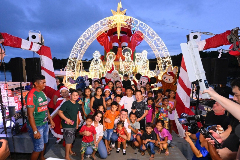 O projeto, que teve início no dia 1º de dezembro, percorreu os rios amazônicos com uma balsa natalina totalmente iluminada, decorada, com personagens temáticos, realizando a distribuição de cestas básicas, panetones, latas de leite e brindes para a comunidade, promovendo momentos de alegria e integração para famílias que vivem em áreas de difícil acesso.
