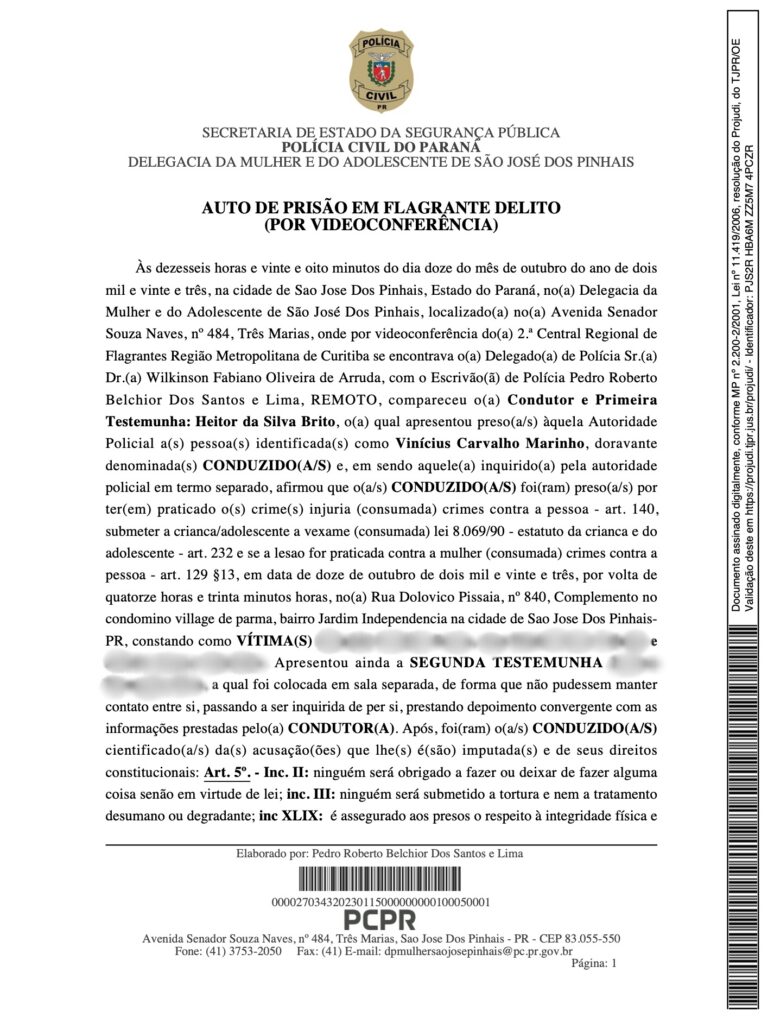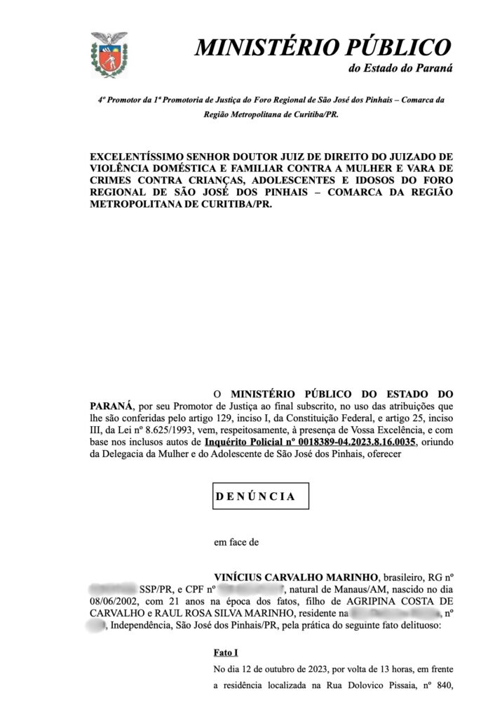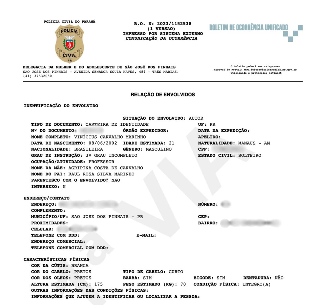 De acordo com as denúncias, Vinicius é acusado de agressões físicas e psicológicas contra a ex-namorada, uma jovem de apenas 21 anos. Segundo informações, os episódios de violência começaram após o casal se mudar de São José dos Pinhais (PR) para Manaus. A vítima, que prefere não se identificar, relatou que o relacionamento se tornou um inferno logo após a mudança, com frequentes xingamentos, puxões de cabelo e comportamentos agressivos. Segundo ela, o cenário era agravado por episódios de abuso psicológico, que teriam contado inclusive com a participação de familiares de Vinicius. As agressões evoluíram para situações ainda mais graves. Em um dos episódios narrados à polícia, Vinicius teria fechado a porta de um carro na perna da vítima durante uma discussão e, em outra ocasião, usado o antebraço para pressionar o pescoço dela. O caso mais chocante, porém, ocorreu após uma confraternização, quando o lutador teria forçado doces retirados do lixo na boca da companheira, levando-a a desmaiar. Mesmo após o desmaio, as agressões teriam continuado. Diante da escalada de violência, a mulher buscou ajuda judicial e conseguiu uma medida protetiva contra Vinicius, além de ingressar com ação contra os pais dele, apontados como participantes do abuso psicológico.