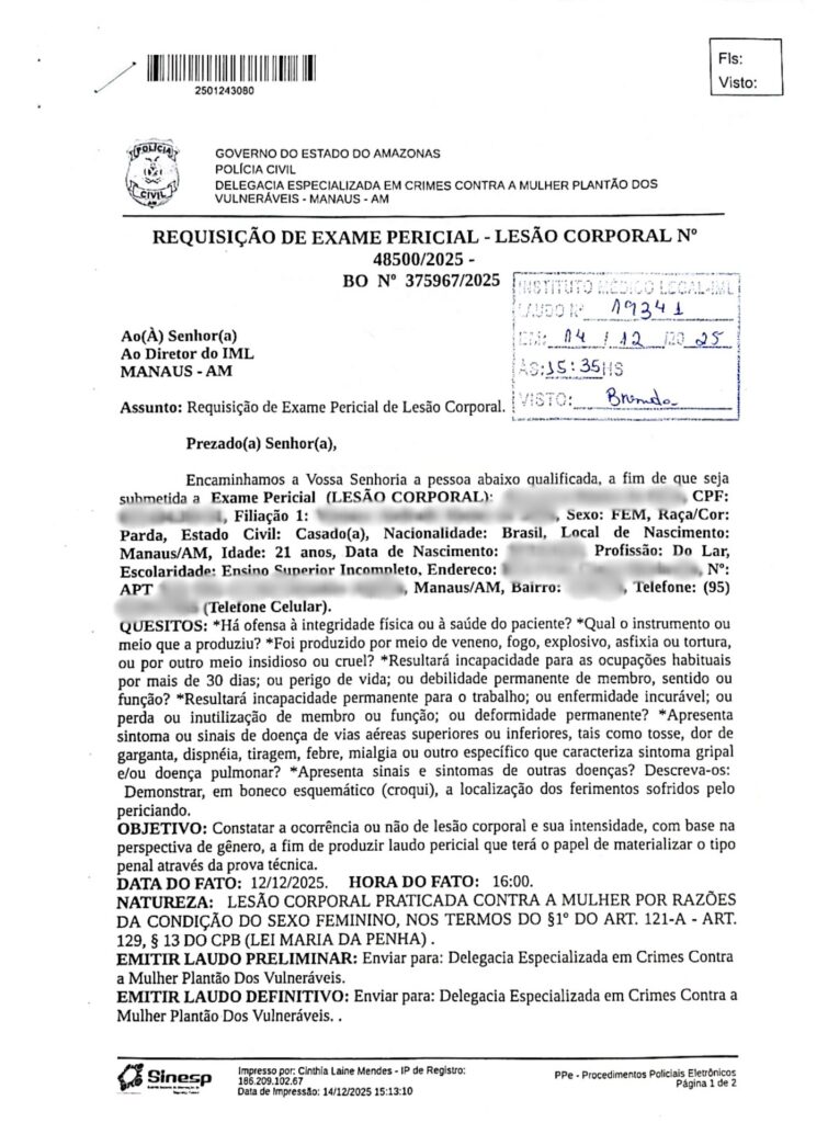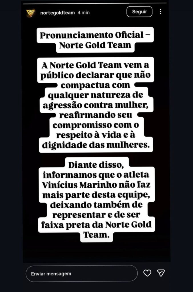 Manaus – A denúncia exclusiva publicada pelo Portal CM7 Brasil e pela presidente da Virada Feminina do Amazonas, Cileide Moussallem, sobre um grave caso de violência doméstica envolvendo o lutador de jiu-jitsu Vinicius Carvalho Marinho, de 23 anos, teve desdobramentos imediatos no meio esportivo. Após a repercussão do caso, a Norte Gold Team divulgou uma nota oficial informando o desligamento do atleta e a retirada de sua faixa preta, medida considerada extrema dentro da modalidade.